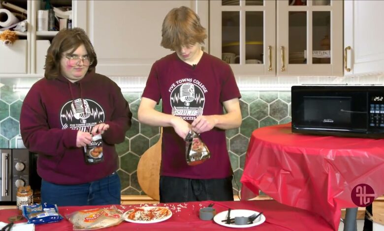 FTC Mass Comm students Amanda Penny, Carter Hendrickson and Tristan McCready (Producer/Editor) cook tortilla pizza in the microwave. Tortilla…