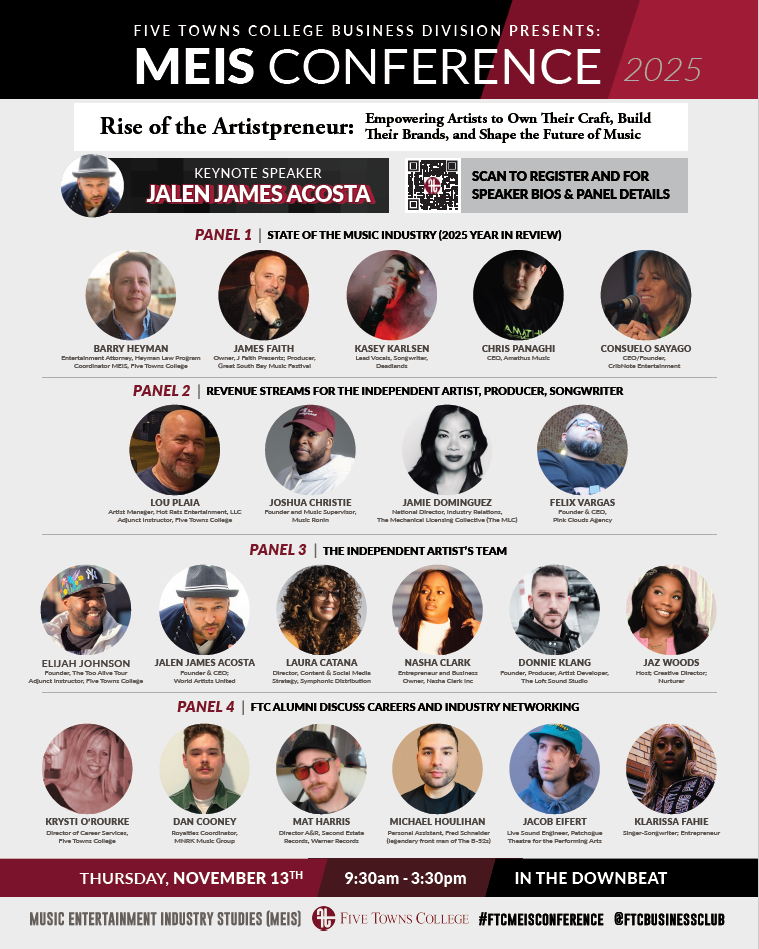 The Five Towns Business Division will host the 2025 MEIS [Music and Entertainment Industry Studies] Conference on Thursday, November 13th, from 9:30 AM to 3:30 PM in the Downbeat. This year’s conference goal aims to “inspire and empower students to take ownership of their creative journeys and thrive as both artists and entrepreneurs,” said Program Coordinator for the MEIS Conference, Professor Barry Heyman.